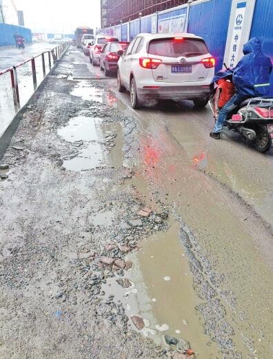 1月5日,記者來到鄭州農(nóng)業(yè)路與桐柏路交叉口附近,該處有農(nóng)業(yè)路快速通道工程。其中,該工程的保通路是一個(gè)雙向兩車道,私家車、電動車和行人共用一個(gè)車道行駛。一條寬約2米,長約100米的道路路基被碾軋破損,每隔1米就出現(xiàn)一個(gè)大坑。因天降小雨,大坑積水,讓本就狹窄的道路上車輛通行更加緩慢。其中,一部分大坑上面鋪有鋼板,但私家車經(jīng)過時(shí)碾軋鋼板,濺出1米多高的水花。