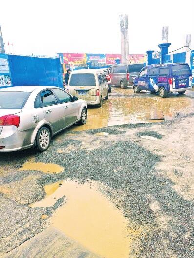 鄭州農(nóng)業(yè)路與沙口路附近的保通路上,交叉口東西兩側(cè)各有一處較大的深坑。西側(cè)一處深約20厘米,不少電動車主行至坑邊,不敢涉水通過,只能擠進(jìn)快車道行駛,非常危險(xiǎn);東側(cè)一處大坑面積約60平方米,水坑最深處可達(dá)30厘米,私家車從此經(jīng)過,濺起一片水花。該大坑正處一個(gè)丁字路口正中央,且沙口路、農(nóng)業(yè)路的車輛僅有此處一條通道,因車輛通行緩慢,路面私家車排起一條長龍。