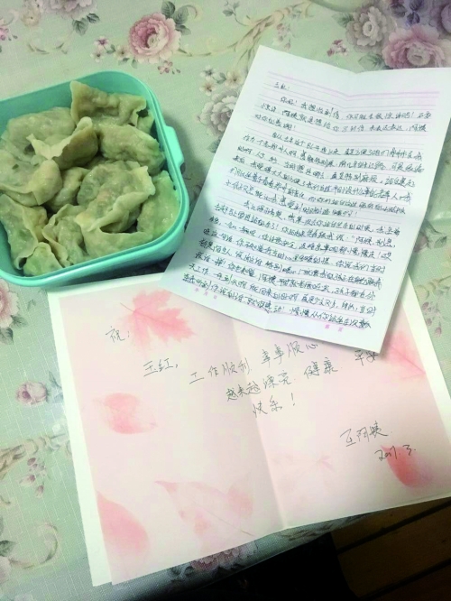 接過(guò)餃子的董玉紅感到很意外,緊接著,王大娘又從包里掏出了一封信和一張賀卡,一起遞到了董玉紅手中。打開(kāi)信的一瞬間,董玉紅眼里的淚花打著轉(zhuǎn),“沒(méi)有想到,王大娘會(huì)親自給我寫(xiě)了這么長(zhǎng)的一封信……”
