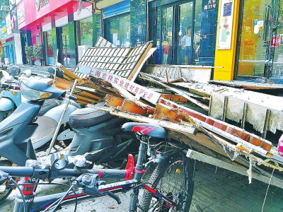 墜落招牌的店鋪,位于大學(xué)路鄭州大學(xué)南校區(qū)東門口附近。事發(fā)5分鐘后,記者在現(xiàn)場看到,招牌斷裂成三大塊,兩塊墜落在店鋪入口處,另外一塊墜落人行道上,砸中了停的幾輛電動(dòng)車(如圖)。