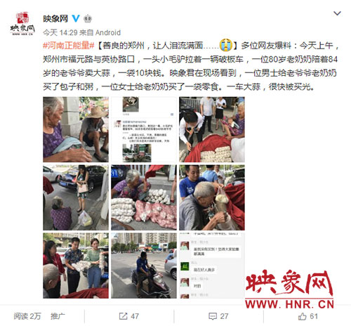 映象網(wǎng)快訊(記者 王寬 趙輝 實(shí)習(xí)生 張璨榮 文/圖)“我能想到最浪漫的事,就是和你一起慢慢變老……”8月23日中午,鄭州街頭上演暖心一幕,年過八旬的中牟老農(nóng)趕著毛驢車?yán)习檫M(jìn)城賣大蒜,一車蒜被搶購一空,卻裝滿了鄭州愛心市民送的食物。