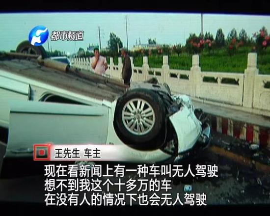 王先生說,當時他將車停在路邊,準備下車打電話,沒想到剛剛下車,車就自個兒跑了。汽車一路“狂飆”,王先生眼睜睜地看著自己的轎車撞向路中間的轉盤。