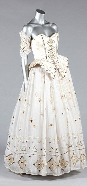 據(jù)悉,該款禮服正是出自王妃曾經(jīng)的婚紗設(shè)計(jì)者伊曼紐爾夫婦(David&Elizabeth Emanuel)之手。該禮服在1986年時(shí)被推出,是一條飾滿了金片、水晶和珠串的精美華服。由于王妃曾在較短時(shí)間內(nèi)三次穿著該禮服出席公眾場合,因此世人皆認(rèn)定這是王妃最鐘愛的服裝。