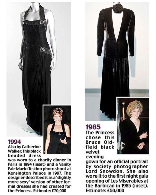左:Catherine Walker黑色天鵝絨禮服。1997年,攝影大師Mario Testino為戴安娜王妃在肯辛頓宮拍攝的《名利場》大片中,她就穿著這件禮服。估價(jià):7萬英鎊