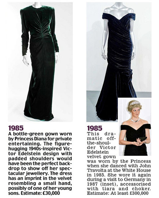 左:Victor Edelstein綠色天鵝絨禮服。1985年出席私人聚會時(shí),戴安娜王妃穿著這條禮服。估價(jià):3萬英鎊