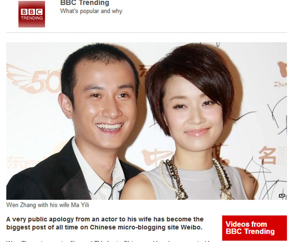終于,出現(xiàn)在外國媒體報道中的華人明星名字不再只是鞏俐、章子怡等國際腕兒了。霸占國內(nèi)娛樂圈頭條的“文章出軌事件”,已經(jīng)漂洋過海到了全球各地,出現(xiàn)在多家國外媒體的版面上。包括英國BBC、《每日郵報》、美國《美聯(lián)社》、《紐約每日新聞報》、《好萊塢記者報道》、《娛樂在線》、澳洲《悉尼先驅(qū)晨報》、加拿大CBC、越南《民智報》新聞網(wǎng)站(dantri.com.vn)等多家外媒都對此事進行了報道,并集體關(guān)注文章道歉微博所打破的社交媒體轉(zhuǎn)發(fā)記錄。