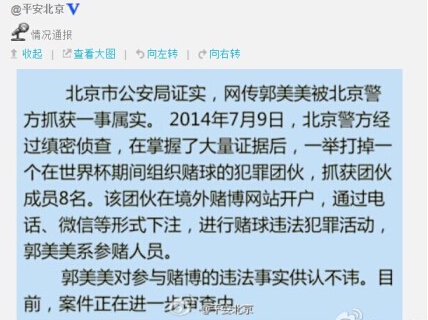 2014年7月10日,據(jù)法制晚報播報:據(jù)線報,郭美美因賭球被北京警方抓了!