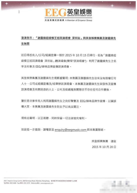 謝霆鋒經(jīng)紀人霍汶希表示“本集團及謝霆鋒先生從來沒有授權任何人士、公司或組織宣傳或舉辦該演唱會。本集團及謝霆鋒先生于發(fā)布及宣傳該演唱會及有關訊息的人士、公司及組織毫無關系,不存在任何合作關系。”以免粉絲受騙,同時保留一切法律追究權利。