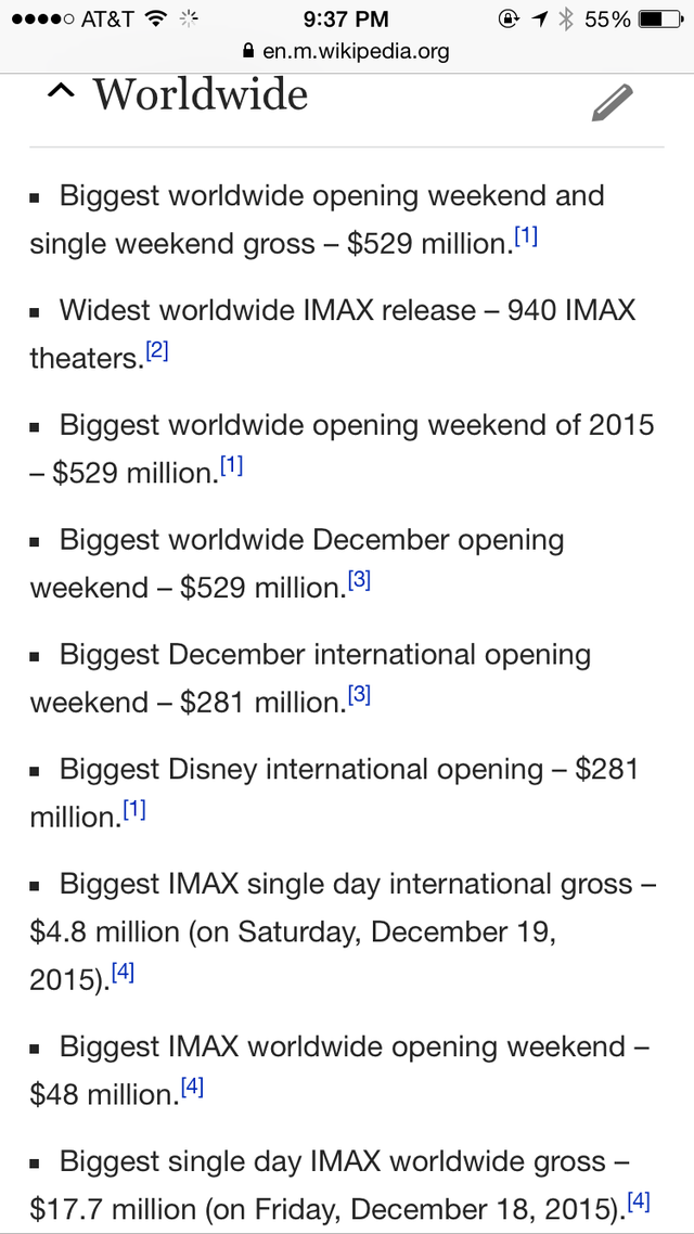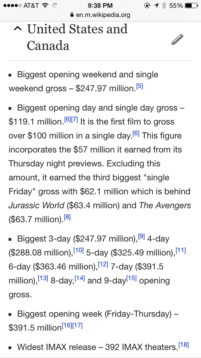 截圖只占該詞條的五分之一都不到哦,這齊刷刷的一片 Biggest/ Widest 真是氣壯山河啊!預(yù)計(jì)到本周末《星戰(zhàn)7》將在北美拿下5億票房,比前任紀(jì)錄保持者《侏羅紀(jì)世界》快了近整整一倍之多!”票房記錄粉碎機(jī)“之稱果然名副其實(shí)!