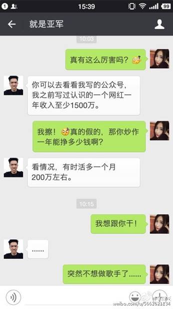 6月6日,某酒吧駐唱女歌手通過自己的微博發(fā)布了幾張聊天截圖。截圖內(nèi)容也是著實讓大家大吃一驚。聊天內(nèi)容大意是酒吧駐唱女歌手找了一位可以網(wǎng)紅經(jīng)紀人,期望他能夠把自己炒成網(wǎng)絡(luò)紅人,而每次推成功一次紅人,大概費用至少是20萬起。該網(wǎng)紅經(jīng)理自稱打造網(wǎng)紅每月收入百萬。