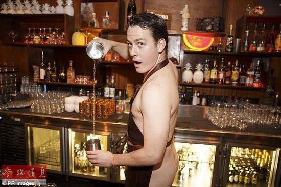 餐廳里的服務(wù)員們都只穿著裸色的內(nèi)褲,并在腰上圍著樹(shù)葉??瓷先ズ苡泄畔ED風(fēng)格。