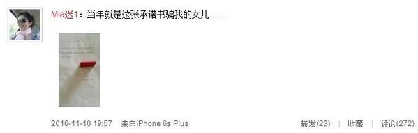 11月10日晚,張靚穎媽媽通過微博曝馮柯前妻魏蕾的離婚承諾書,魏蕾承諾在2006年1月內(nèi)在律師的監(jiān)督下與馮軻辦理離婚手續(xù),條件是馮柯承擔(dān)其女兒馮亞孟至中學(xué)比亞的所有學(xué)習(xí)費(fèi)用,承諾書簽訂時間為2005年12月30日。