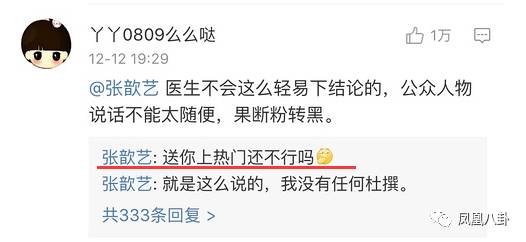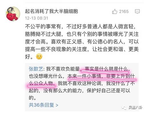 至于張歆藝在評論中說的別把我當公眾人物,小妹(鳳凰八卦微信號:entifengvip)也不能茍同,從事演員這份職業(yè),微博粉絲過千萬,在享受公眾人物的便利時(小妹(鳳凰八卦微信號:entifengvip)就做不到拿別人的名字掛號),是不是也應該承擔起公眾人物的社會責任呢?