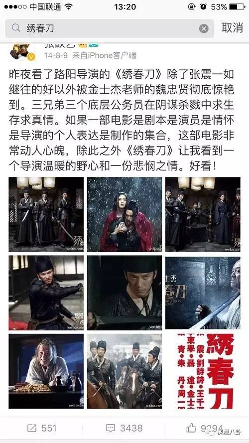 2014年,張歆藝發(fā)一條微博夸贊電影《繡春刀》的導演和男演員。