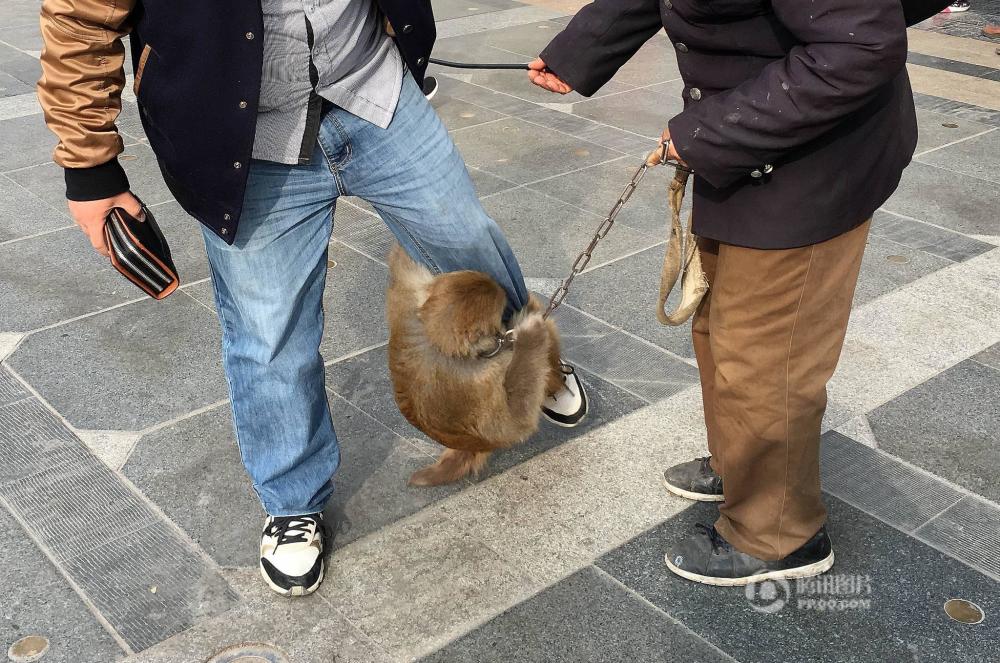 2016年12月11日,在合肥一公園門口,有幾只猴子在主人的指令下,緊緊抱住行人的腿部,幫主人討要1元“擁抱費(fèi)”,如對方不給則緊抱不放。馬方/視覺中國