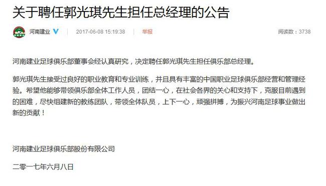 6月8日,中超河南建業(yè)官方宣布,郭光琪將出任俱樂部總部經(jīng)理一職。俱樂部希望在郭光琪的帶領下,球隊上下一心,為振興河南足球做出新貢獻。河南建業(yè)足球俱樂部董事會經(jīng)認真研究,決定聘任郭光琪先生擔任俱樂部總經(jīng)理。