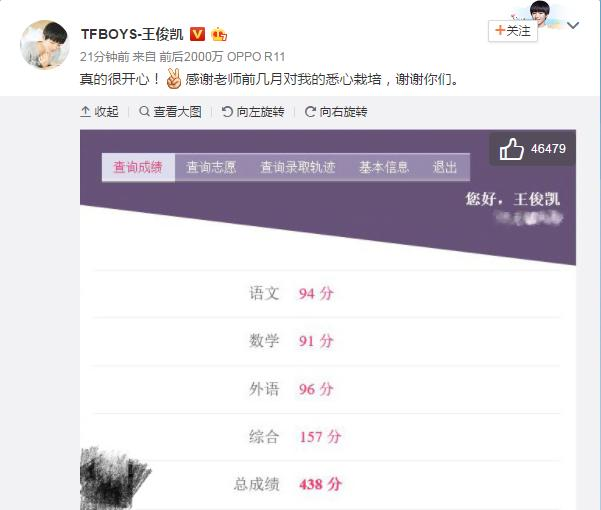 近幾日,2017年全國統(tǒng)一高考成績都陸續(xù)出爐,網友們非常關心的參加今年高考的TFboys王俊凱的成績今日也終于公布了!