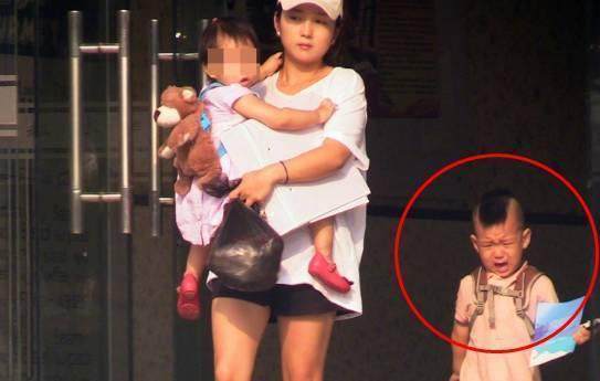 何潔手里抱著女兒 兒子七寶在后面追著哭