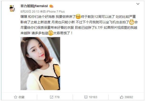 8月20,雪莉在小號(hào)微博@“菲力姐姐jfiensksl ”公布懷孕:“嘿嘿,和你們說(shuō)個(gè)好消息,我要做媽媽了,終于熬到12周可以說(shuō)了,吐的比較嚴(yán)重,影響了之前上新進(jìn)度,月底也只能小新,不過(guò)下個(gè)月我就可以坐飛機(jī)出去拍了。會(huì)盡量給你們保質(zhì)保量帶來(lái)好看的衣服,目前已經(jīng)胖了6.7斤,如果照片視頻里的我越來(lái)越胖,請(qǐng)多多包涵,太容易餓了! ”