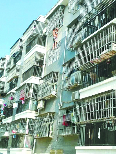 陳芳勇踩在3樓的防盜窗上,托頂著女童 通訊員王基達 攝