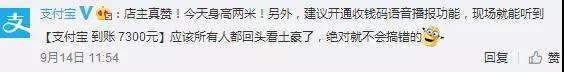 對(duì)此,支付寶官方表示,建議開(kāi)通收錢碼語(yǔ)音播報(bào)功能,現(xiàn)場(chǎng)就能聽(tīng)到“支付寶到賬7300元”,應(yīng)該所有人都回頭看土豪了,絕對(duì)就不會(huì)搞錯(cuò)的。