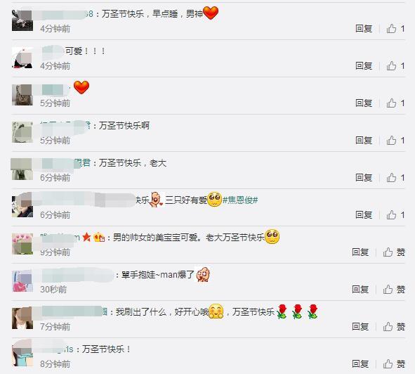 網(wǎng)友也紛紛評(píng)論說:“男的帥女的美寶寶可愛。老大萬圣節(jié)快樂”、“老大千鈺姐萬圣節(jié)快樂?。。∥以趯懽鳂I(yè)里贏來了萬圣節(jié)orz……老大晚上早點(diǎn)睡呀,雖然可能會(huì)有很多小孩子來敲門說“不給糖就搗蛋”吧,hhhhhhh”