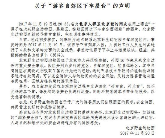 今天上午,記者從北京大興野生動物園了解到,該事件發(fā)生在園內(nèi)自駕游覽區(qū)內(nèi),事發(fā)時間為11月19日,目前初步查明,男子投擲的物品為胡蘿卜(飼料)。