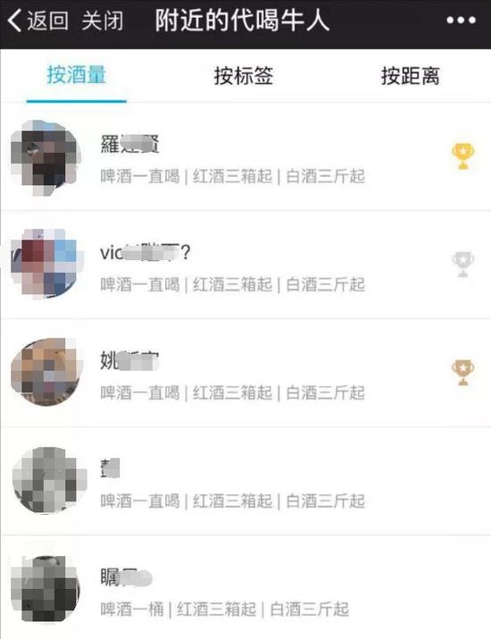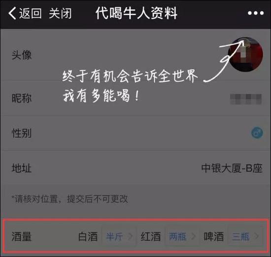 懷著對這項“神服務”的好奇,韓國記者還在中國特地體驗了一番。據(jù)《中央日報》報道,4日晚,韓國記者辦公室所在的北京市中心建國門一帶,記者嘗試使用了該軟件。建國門這附近還不算娛樂區(qū)域,但在半徑400米以內(nèi)地圖上跳出10名代喝人的位置。記者在點擊其中一名代喝人后立即彈出他的自我介紹——“奧運會金牌級喝酒選手”,“酒量是白酒兩瓶、啤酒一箱”。