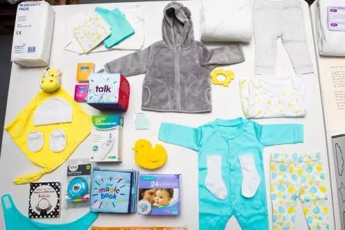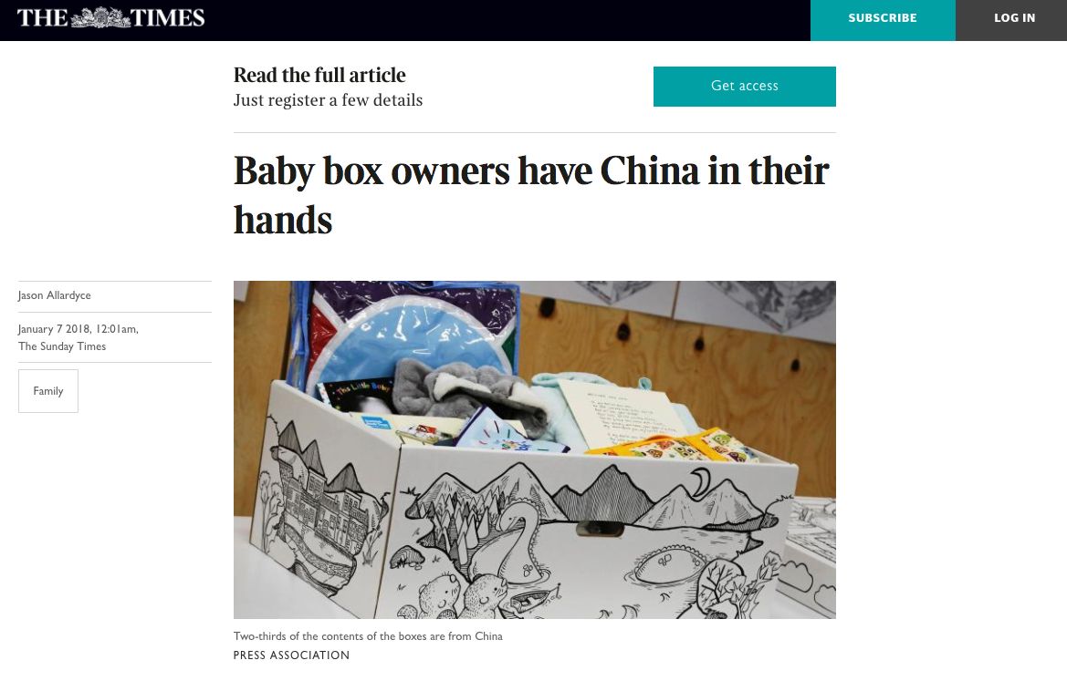 嬰兒箱里的嬰兒睡袋、背心、褲子、手套和帽子都是中國(guó)制造,甚至連圍嘴、浴巾、指甲銼和溫度計(jì)等一些物件也來(lái)自中國(guó)。盒子里只有毯子和毛巾是由歐洲制造的,產(chǎn)婦衛(wèi)生巾來(lái)自英國(guó)諾丁漢郡,而一本精裝書(shū)由倫敦出版。