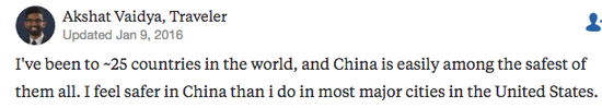 對(duì)此,外國網(wǎng)友的回答幾乎都是“當(dāng)然安全”。甚至有人說:“說句你不愛聽的,在你自己國家獨(dú)自旅行可能都比在中國旅行危險(xiǎn)。我在中國生活了兩年半,從沒覺得身邊有危險(xiǎn)。”