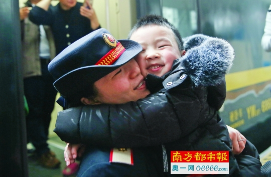 2月10日16時57分,深圳開往烏魯木齊的Z 230次列車??亢怅栒荆芍麑?dǎo)演陳可辛執(zhí)導(dǎo)的短片《三分鐘》原型列車員劉鐘與兒子丁丁在站臺短暫相聚三分鐘。緊緊的相擁后告別在即,劉鐘眼中含淚,她還要上班至15日。不過,讓劉鐘特別開心的是今年她終于可以回家過除夕,這是11年來第一次。 南都記者 馬強 攝