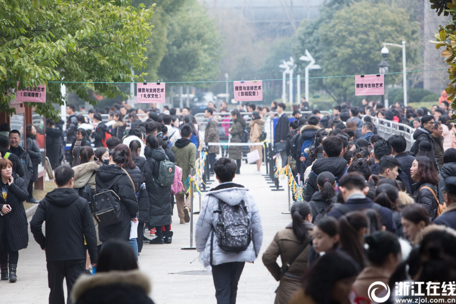 2月24日,浙江傳媒學(xué)院2018年播音與主持藝術(shù)等藝術(shù)類專業(yè)復(fù)試開考。上午8時(shí),播音樓前候考學(xué)生已經(jīng)排起百余米的長隊(duì)。今年,考生多為2000年出生的“千禧寶寶”,雖然校方要求素顏面試,但考生們青春滿滿依然養(yǎng)眼吸睛。