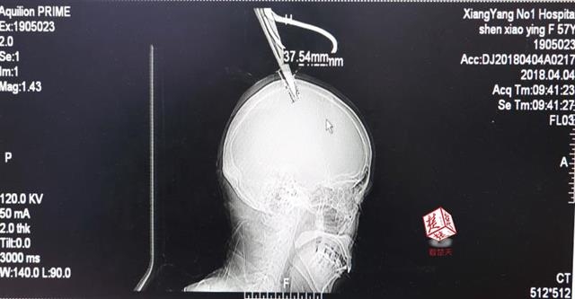 醫(yī)生檢查發(fā)現(xiàn),剪刀刀尖斜嵌在沈某顱骨里,離腦髓只有兩三毫米。所幸是斜著插進去,如果是垂直刺入,很有可能造成癱瘓。最終經(jīng)過手術(shù),剪刀被取出,沈某目前仍在ICU進一步觀察。