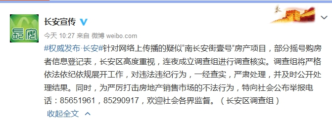 長安區(qū)委宣傳部表示,針對網絡上傳播的疑似“南長安街壹號”房產項目,部分搖號購房者信息登記表,長安區(qū)高度重視,連夜成立調查組進行調查核實。調查組將嚴格依法依紀依規(guī)展開工作,對違法違紀行為,一經查實,嚴肅處理,并及時公開處理結果。同時,為嚴厲打擊房地產銷售市場的不法行為,特向社會公布舉報電話:85651961,85290917,歡迎社會各界監(jiān)督。