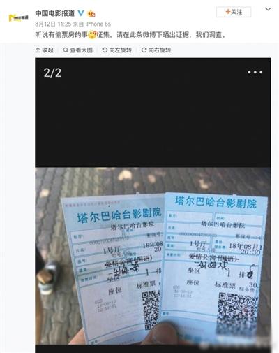 8月12日下午,CCTV6電影頻道旗艦欄目官方微博中國(guó)電影報(bào)道發(fā)微博稱,“聽(tīng)說(shuō)有偷票房的事,征集,請(qǐng)?jiān)诖藯l微博下曬出證據(jù),我們調(diào)查。”配圖中,是兩張《愛(ài)情公寓》的電影票,但電影名字被人工劃掉改成了《一出好戲》。在該微博的評(píng)論區(qū),也有不少網(wǎng)友聲明自己遭遇同樣狀況。接著,“愛(ài)情公寓涉嫌偷票房”的話題迅速登上熱搜榜。