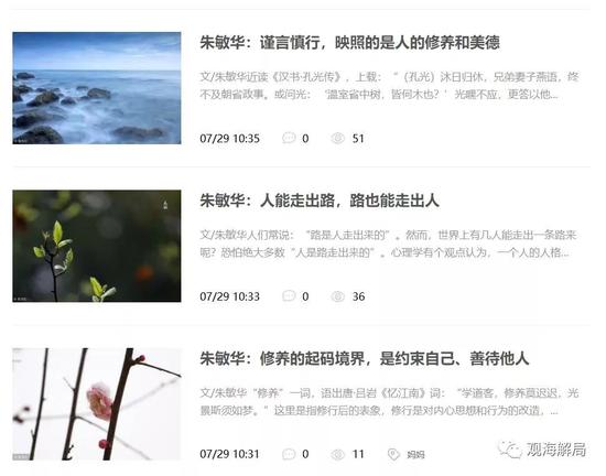 這些文章以游記、散文、人生感悟?yàn)橹鳎灿幸徊糠衷姼?。其中,最新的一篇為《聞過則喜 折射的是胸襟格局和修養(yǎng)境界》,發(fā)表于8月13日,也就是本周一。