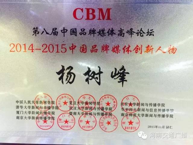 本屆論壇上,河南交通廣播總監(jiān)楊樹峰榮獲2014-2015中國品牌媒體創(chuàng)新人物稱號,這是對他個人成就的肯定,更體現(xiàn)了河南交通廣播運管機制的成功,人文關(guān)懷、扁平化管理,民主決策、智慧碰撞,從決策層發(fā)出的指令,成為掌控河南交通廣播精準運行,走向成功的靈魂,而我們一切的努力,都是為了實現(xiàn)一個目標(biāo):無論何時、何地,無論現(xiàn)在、未來,伴你出行每一刻。