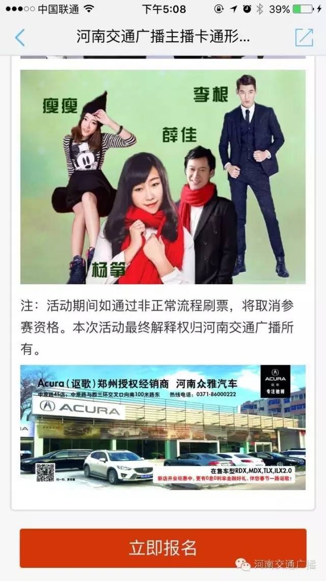 河南交通廣播“主播卡通形象設計大賽”已經(jīng)啟動,畫出您心目中主播的卡通形象,上傳至交廣領航客戶端參與大賽,優(yōu)勝者將獲得河南眾雅謳歌4S店提供的現(xiàn)金油卡大獎。