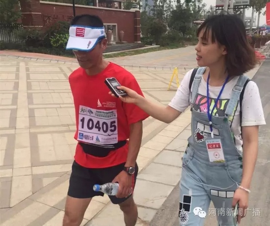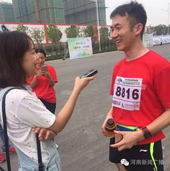 僅僅過了2小時20分,終點(diǎn)迎來第一位沖向終點(diǎn)的高先生,氣喘吁吁的他在接受我們采訪時依然腳步穩(wěn)健。