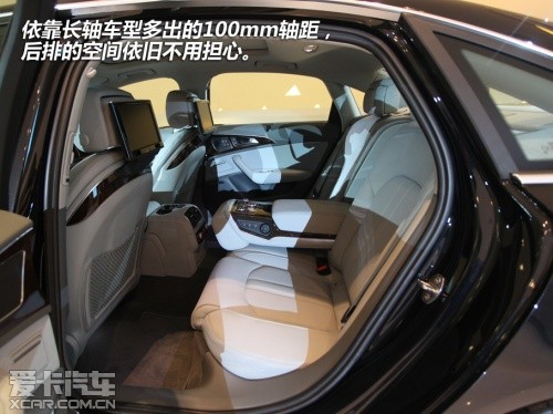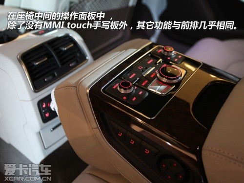 轉(zhuǎn)至后排,這里應(yīng)該同樣是車主們最為關(guān)注的,依靠長(zhǎng)軸車型多出的100mm軸距,后排的空間依舊不用擔(dān)心。而影音娛樂系統(tǒng)也同樣沒有被忽視,在座椅中間的操作面板中 ,除了沒有MMI touch手寫板外,其它功能與前排幾乎相同。