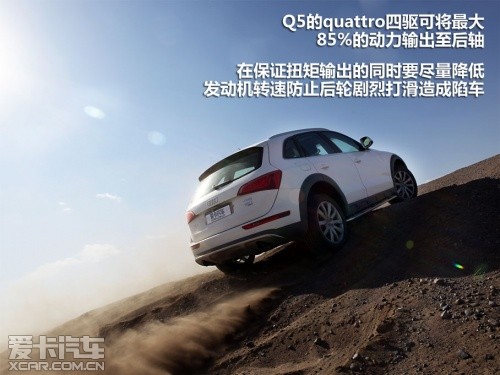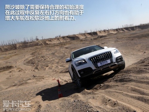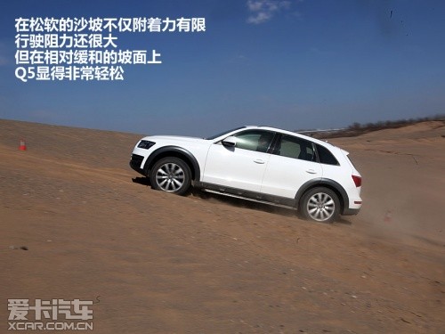 沙坡前半部分的坡度相對(duì)要緩一些,而奧迪Q5通過(guò)這里的過(guò)程自然也是毫不費(fèi)力。那么在接下來(lái)更陡的后半部分當(dāng)中,坡度的增大導(dǎo)致了車(chē)速急劇下降,此時(shí)松軟的沙子也就成為了車(chē)輛繼續(xù)攀爬的絆腳石,恰恰也就在此刻,檢驗(yàn)quattro四驅(qū)系統(tǒng)真正能耐的時(shí)候隨之而來(lái)。