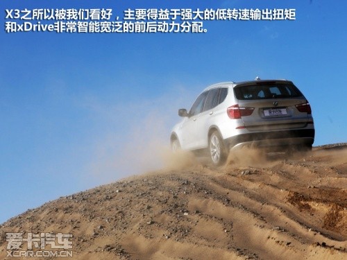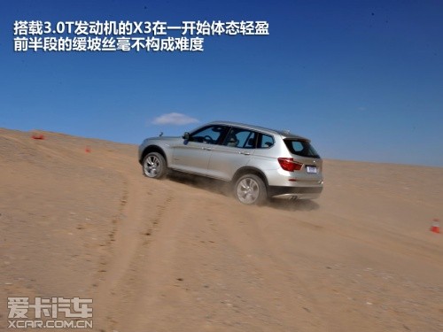 或許是奧迪Q5完成測(cè)試的過(guò)程比較順利,我們對(duì)接下來(lái)即將登場(chǎng)的寶馬X3也普遍比較看好,這或許就是思維慣性帶來(lái)的固定套路吧。然而在實(shí)地測(cè)試過(guò)程中,這臺(tái)X3攀爬沙丘的過(guò)程卻沒(méi)有表現(xiàn)出它在公路上所煥發(fā)出的霸氣。400?!っ椎淖畲笈ぞ卦诔鞘械缆分?,甚至在高速公路上都是無(wú)與倫比的,但移步至眼前狂風(fēng)大作的沙丘,這400?!っ椎呐ぞ貏t像是心有余而力不足的悲情英雄。