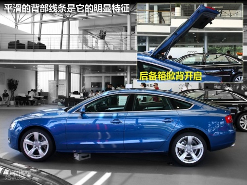 5月23日,奧迪A5/S5全系共10款車型正式在全國(guó)上市,其中包括全新的A5/S5 Cabriolet敞篷轎跑車、A5/S5 Sportback五門轎跑車和全新的A5/S5 Coupe雙門轎跑車,以及充滿動(dòng)感個(gè)性的A5 Coupe 2.0T風(fēng)尚版。今天我們?cè)?S店拍攝到的這輛藍(lán)色的A5為售價(jià)52.8萬的Sportback 2.0T車型。