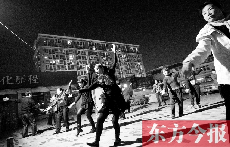 一塊百十平方米的小場(chǎng)地,距離居民樓不到10米。一盞探照燈,一個(gè)可滑動(dòng)的大音響,伴隨著歌曲,三三兩兩的人就火熱開(kāi)跳了。不遠(yuǎn)處,陸續(xù)還有人來(lái)。甩開(kāi)外套,加入隊(duì)伍中。