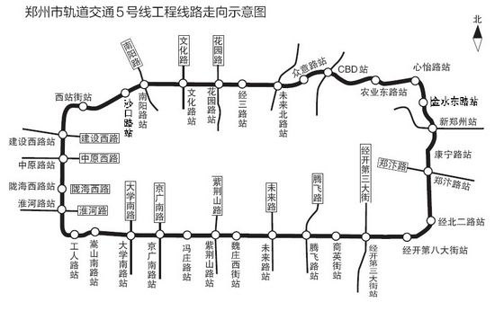 鄭州地鐵5號線線路沿黃河路、黃河東路、商務(wù)外環(huán)路、龍湖外環(huán)路、盛和街、心怡路、經(jīng)開第十大街、航海路、桐柏路和西站路布置,屬于城市核心區(qū)外圍的環(huán)形線路。5號線全長約40.4公里,設(shè)車站32座,換乘站15座,平均站間距約1.26公里。全線設(shè)一段一場,共設(shè)置兩座主變電所,采用集中供電方式。