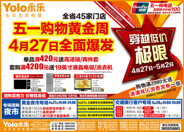 據(jù)悉,今年五一,永樂(lè)電器向中外800多家電器廠家拋出30億規(guī)模的采購(gòu)大單。借助于30億大單的規(guī)模優(yōu)勢(shì),永樂(lè)將于4月27日發(fā)起五一黃金周降價(jià)潮,其中,彩電產(chǎn)品全場(chǎng)7折起,50英寸3D彩電價(jià)格更是首次降價(jià)幅度超過(guò)25%,合資品牌46英寸LED網(wǎng)絡(luò)電視跌破7000元,合資品牌三洋32英寸液晶電視僅售1699元;空調(diào)方面,格力、美的、海爾、志高、伊萊克斯、TCL、三洋等知名空調(diào)廠商的2012主打產(chǎn)品五一期間全部上陣永樂(lè)各大賣場(chǎng),舉行大型特賣活動(dòng),使空調(diào)價(jià)格下降25%左右。1匹空調(diào)永樂(lè)五一最低降至2000元以下,而且不限量供應(yīng),更驚爆的還有一款1.5P的空調(diào)僅售價(jià)1999元,且大量供應(yīng)100臺(tái);洗衣機(jī)價(jià)格平均降幅達(dá)30%,冰箱產(chǎn)品平均降幅也在30%以上,對(duì)開(kāi)門冰箱首度跌破3500元。此外,廚衛(wèi)產(chǎn)品也將出現(xiàn)全年最大幅度的讓利優(yōu)惠,煙灶、熱水器等產(chǎn)品將以直降為主,購(gòu)買套餐組合優(yōu)惠力度更大,方太經(jīng)典歐式煙灶套餐僅3700元左右,華帝廚衛(wèi)全場(chǎng)5折起,伊萊克斯電熱水器驚爆價(jià)999元;暢銷小家電也將大幅優(yōu)惠讓利。3C產(chǎn)品優(yōu)惠力度更大。其中HTC、索尼愛(ài)立信、諾基亞等品牌新品、暢銷品超低價(jià)銷售,千元智能手機(jī)大量供應(yīng);數(shù)碼產(chǎn)品方面,佳能、索尼、尼康、奧林巴斯、三星等品牌全面低價(jià)讓利,降價(jià)幅度高達(dá)20%。1200萬(wàn)數(shù)碼相機(jī)跌破700元。最熱門的佳能600D單反數(shù)碼僅售5287元另加送多重禮品;同時(shí),電腦產(chǎn)品也有不同程度的優(yōu)惠,戴爾2G內(nèi)存、500G硬盤、雙核處理器、獨(dú)立顯卡的筆記本電腦永樂(lè)專享價(jià)僅2999元。