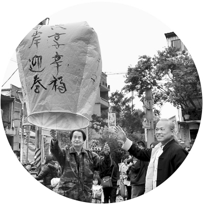 近日,臺灣毫芒雕刻家陳逢顯(右)與傳統(tǒng)天燈工藝大師林國和(左)一起放飛寫有“兩岸迎春· 共享幸福”的天燈。新北市平溪區(qū)放天燈久負盛名,已有百余年歷史。 王東明攝