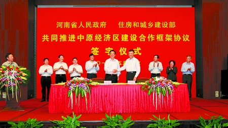 5月10日下午,河南省人民政府與住房和城鄉(xiāng)建設(shè)部在北京簽署《共同推進(jìn)中原經(jīng)濟(jì)區(qū)建設(shè)合作框架協(xié)議》,省委副書記、省長(zhǎng)郭庚茂,住房和城鄉(xiāng)建設(shè)部部長(zhǎng)姜偉新出席簽字儀式,并代表雙方簽署協(xié)議。