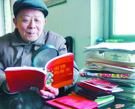 黃先知老人眼睛雖花了,仍每天堅持借助放大鏡閱讀已看了無數(shù)遍的《雷鋒的故事》。