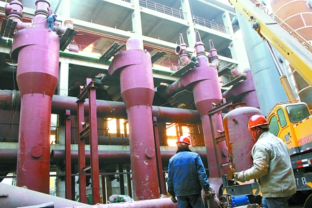 3月16日,河南煤化安化集團公司造氣系統(tǒng)16臺新型節(jié)能造氣爐技術(shù)改造項目正在緊張施工,項目全部投產(chǎn)后,每噸合成氨耗煤有望下降10%以上,年增經(jīng)濟效益5000萬元。 李希軍 攝